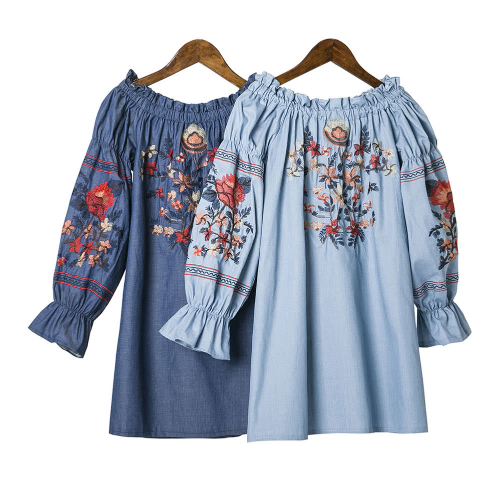 Women Long Embroidery Off Shoulder Top Floral Flare Sleeves Frill Elastic Neck Folk Long Shirt Loose Blouse